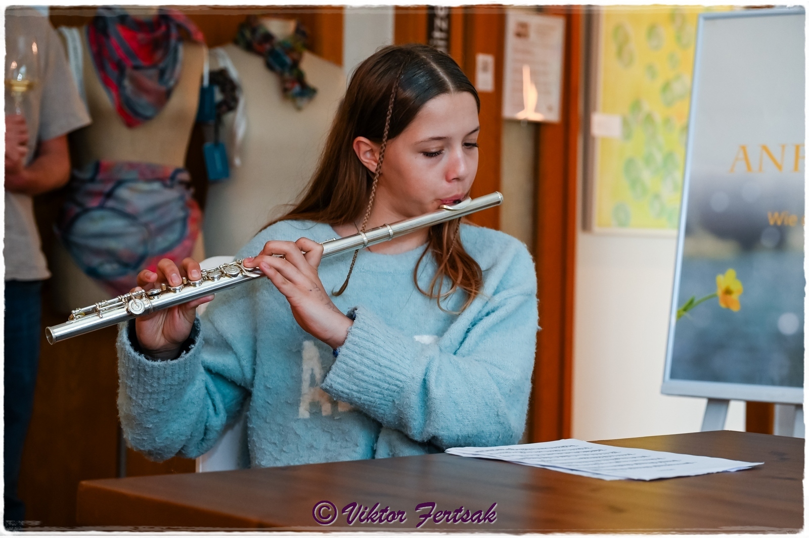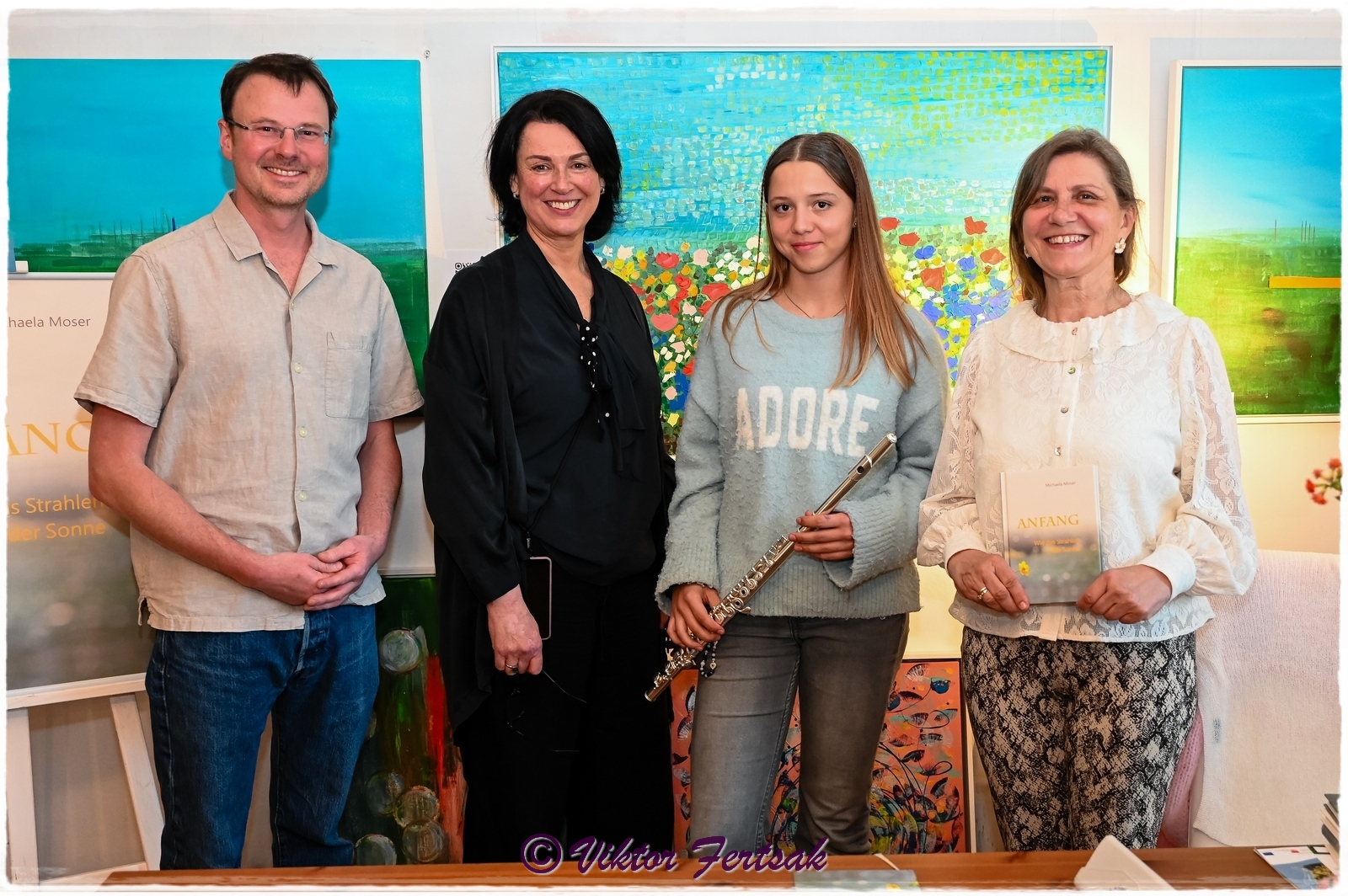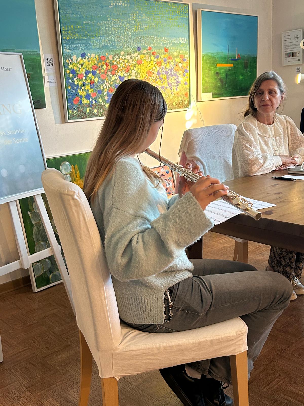 Mit einem Glas Frizzante von Artisan Wines begrüßte Christine Rechnitzer die Besucher:innen zur Vernissage und eröffnete damit einen sinnlichen Dreiklang aus visueller Kunst, feinen Aromen und literarischen Impulsen. Ein besonderer Höhepunkt des Abends war die Lesung von Michaela Moser, die aus ihrem Buch „ANFANG“ vortrug und das Publikum mit ihren Worten tief berührte. Luna Allacher begleitete die Lesung auf der Querflöte.